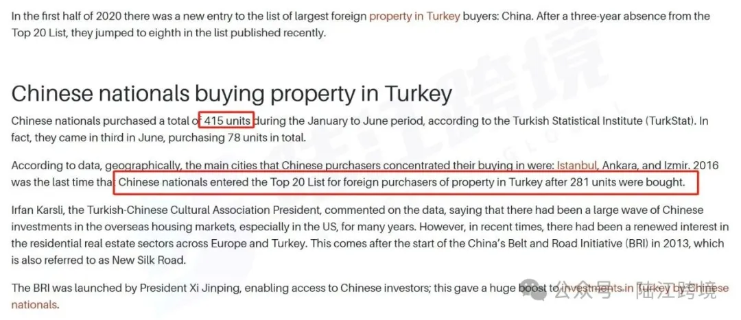 而“中国人开始攻占土耳其房地产”这个说法——源自土耳其统计局(TurkStat)数据与行业报告。中国购房者在2020年1月至6月期间共购入415套房产,在外国购买者中排名第八,并在6月份一度跃居第三位。