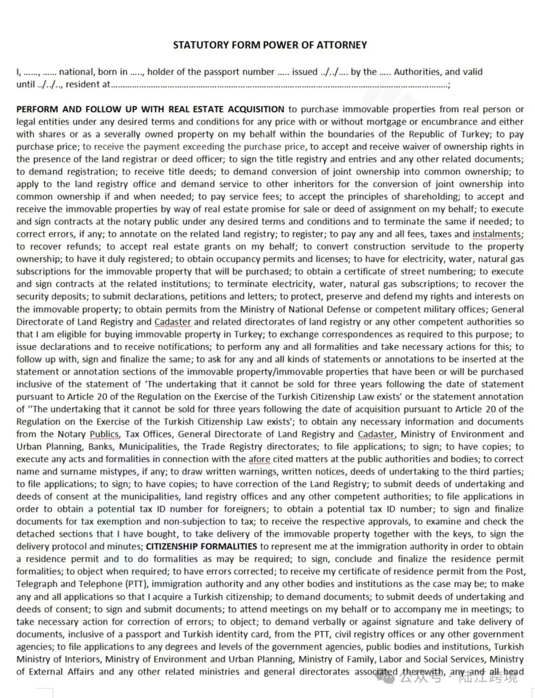 申请人向土耳其授权律师出具委托文件,由其代表申请人办理相关法律手续(如房产过户、公证等)。