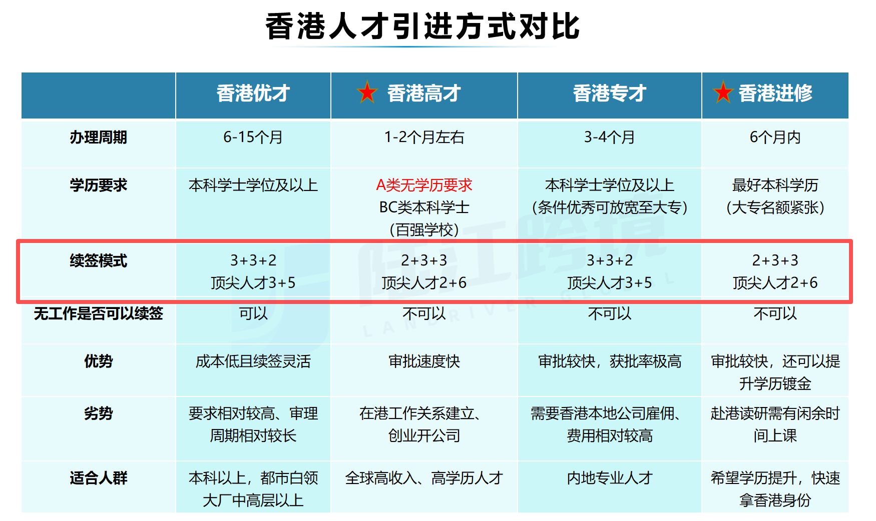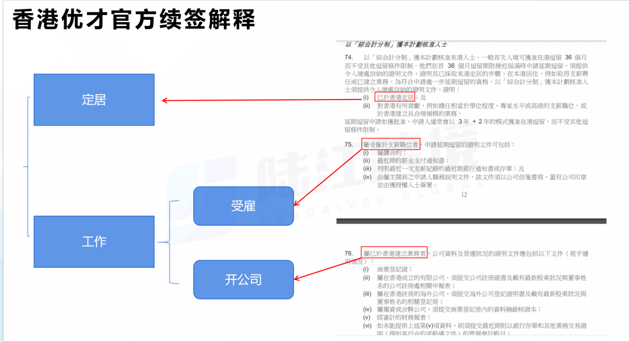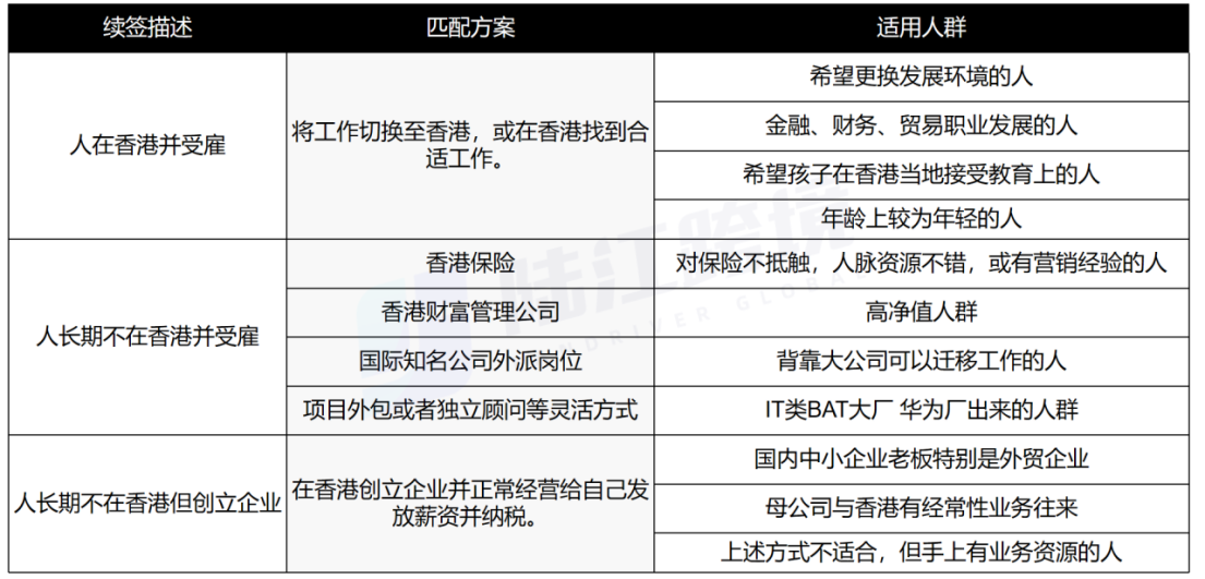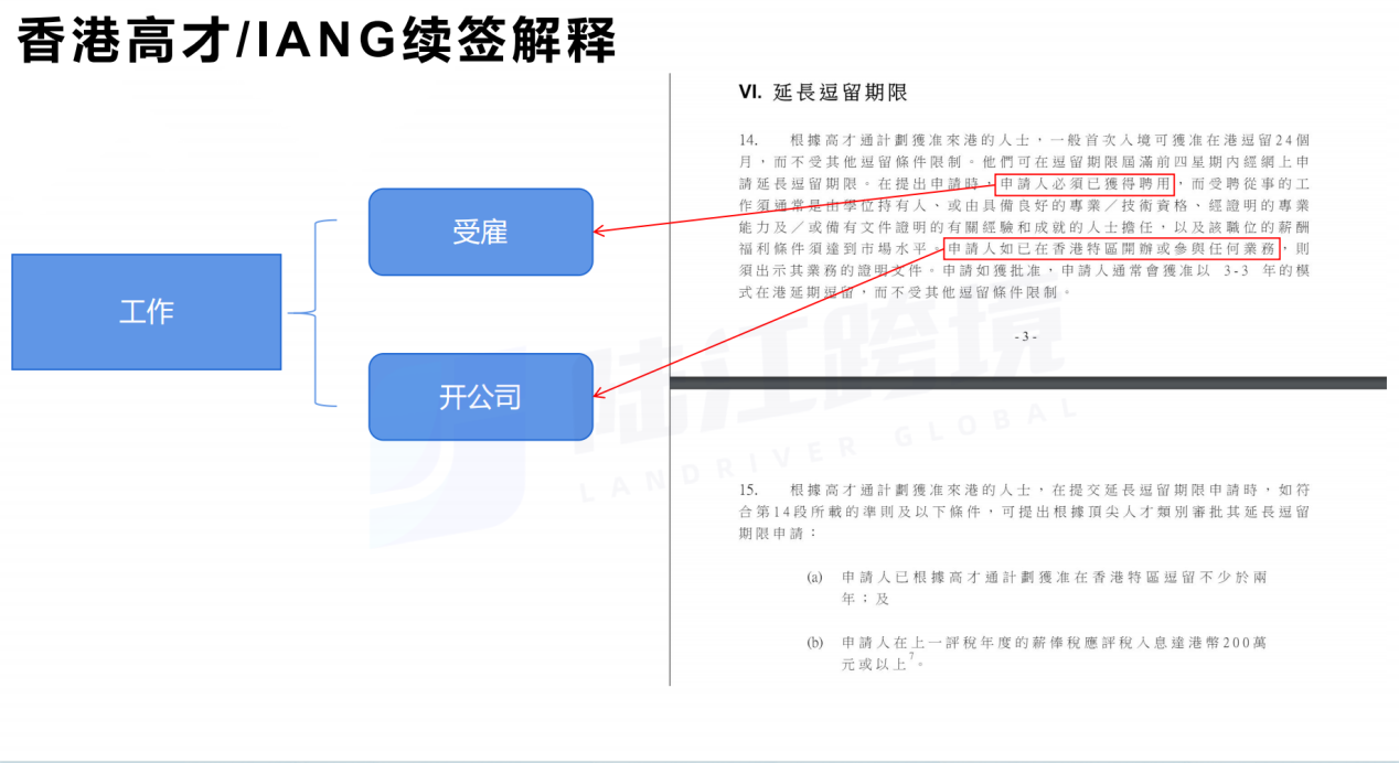 我们通过解读官方针对不同身份的续签政策,发现不同的续签方式万变不离其宗,就是要么在香港找得到合适工作,要么就需要自己开立香港公司创业。如下图所示,高才和IANG类型的身份续签官方要求: