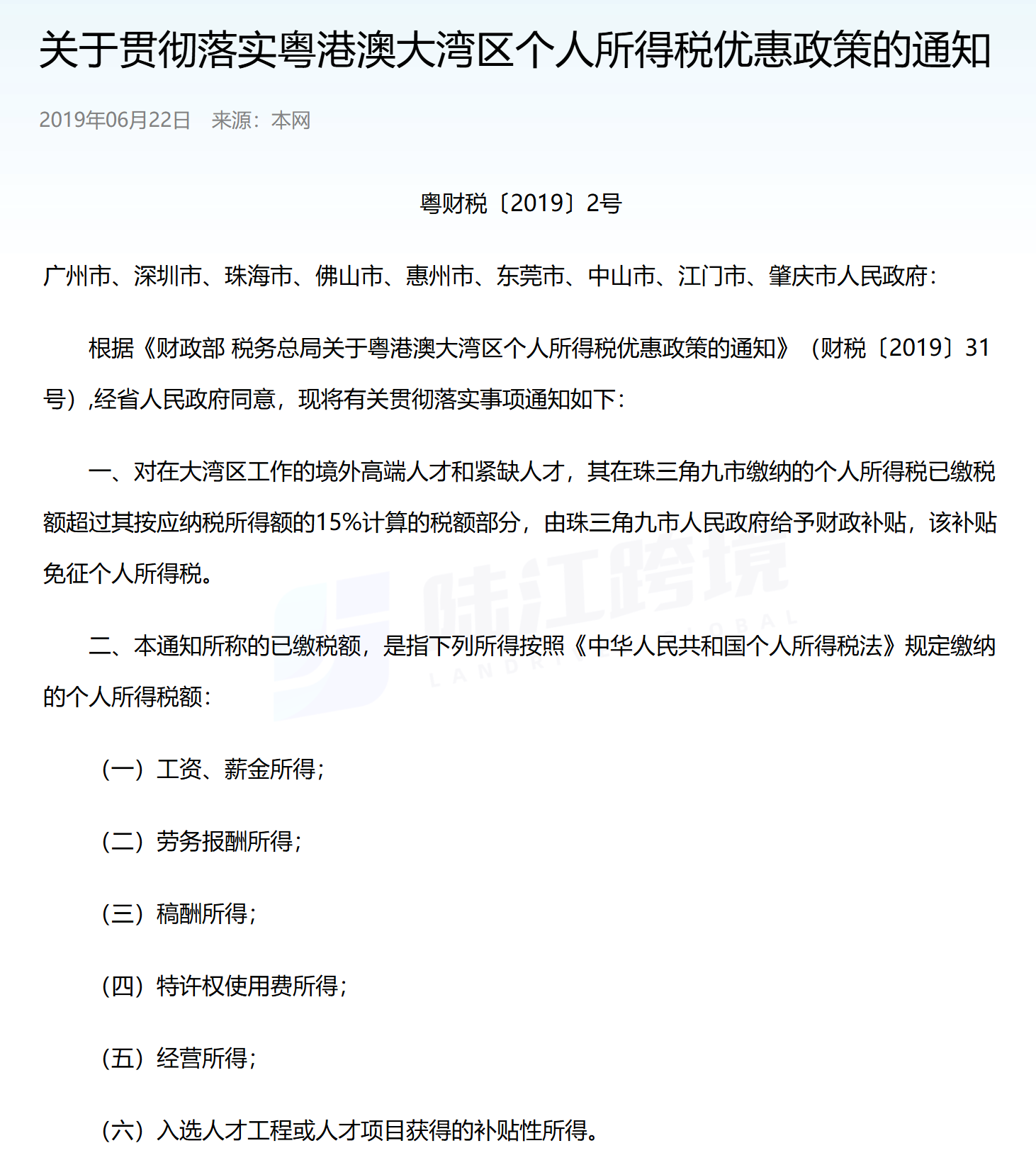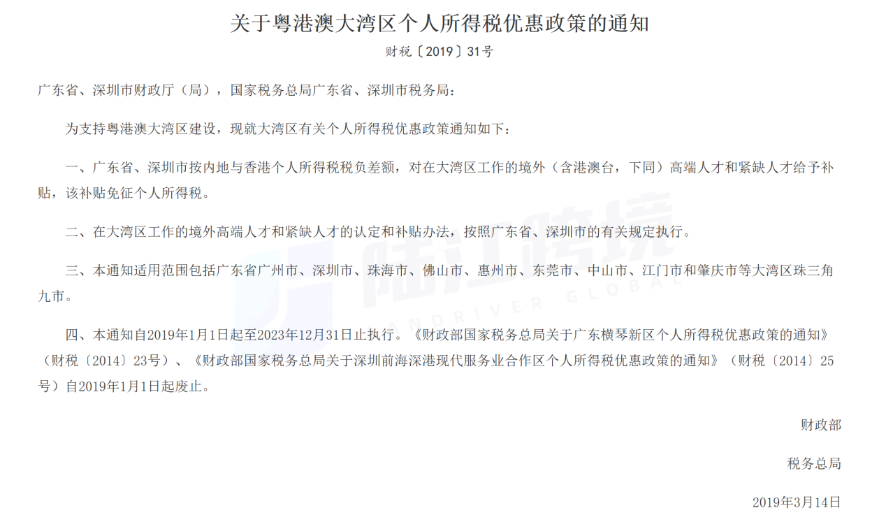 这也不是什么小道消息,而是国家红头文件正式给的福利相关文件,包括《关于粤港澳大湾区个人所得税优惠政策的通知》(财税〔2019〕31号)和《关于贯彻落实粤港澳大湾区个人所得税优惠政策的通知》(粤财税〔2019〕2号),目前该政策持续到2027年底。