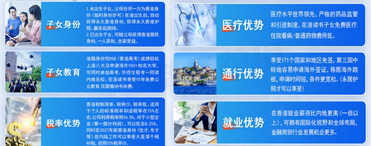 香港税制简单透明,企业所得税低至25%~16.5%,不少企业主通过香港身份进行产业布局、税务优化和跨境业务拓展,实现资产和事业的更优配置。 - 医疗与子女福利不中断