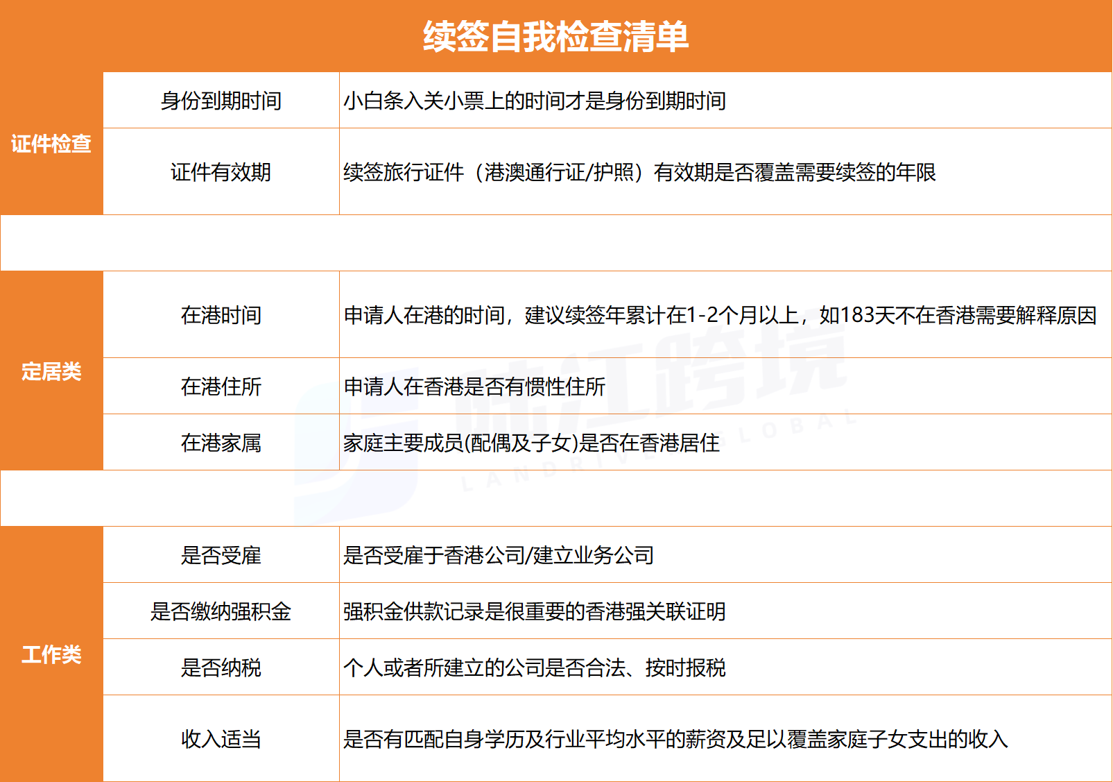 除了受雇之外,我们还根据我们800+的续签实战案例总结了香港身份续签的标准要求,如下是香港身份续签的自我检查清单: