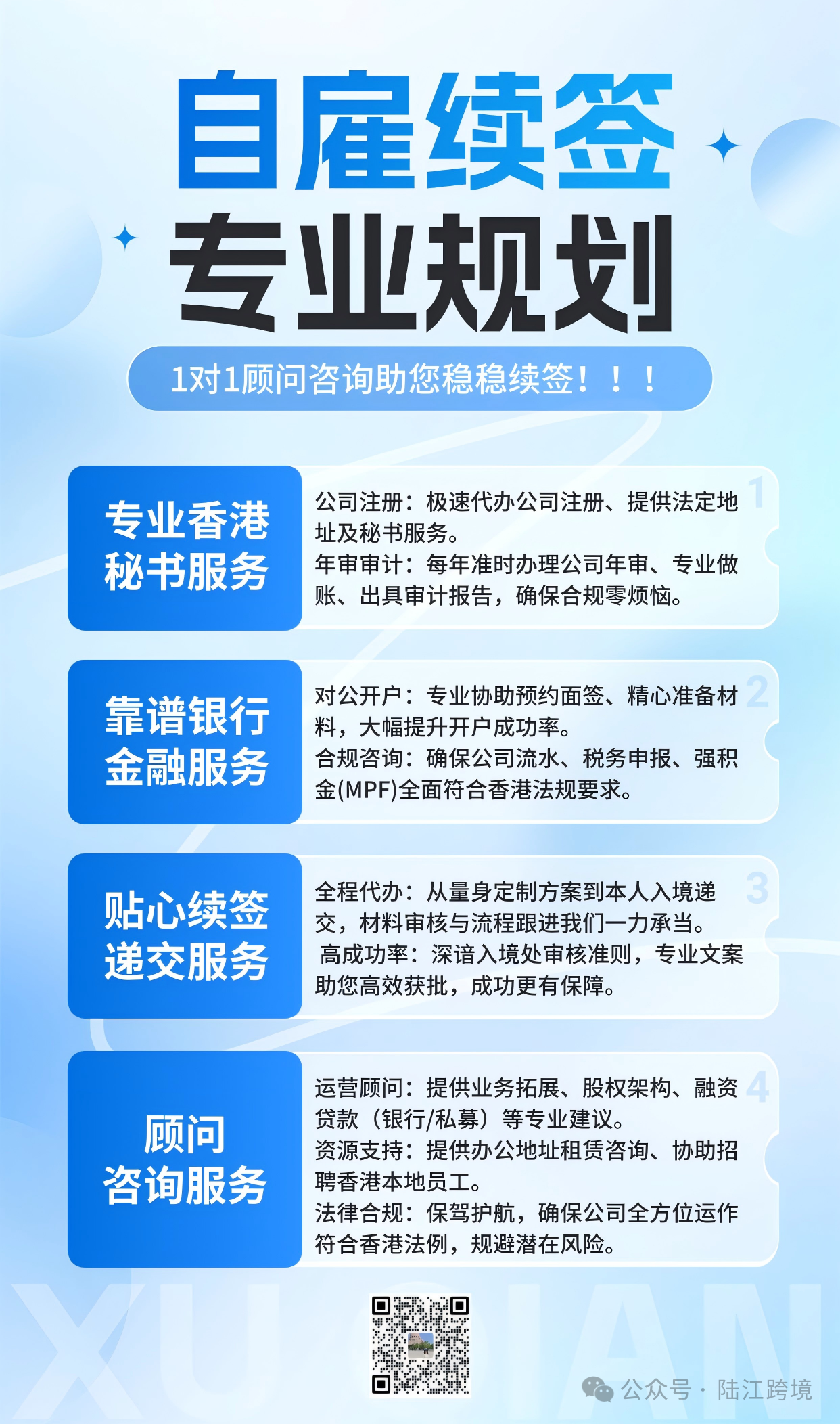 其实还有一种在香港创业开公司的方式来完成续签。相比于需要在香港工作坐班,亦或是完成保险业绩,通过自己开设香港公司来实现自雇续签不仅更加灵活,而且长期不在港的理由也比较好解释,就比如需要在内地拓展业务。